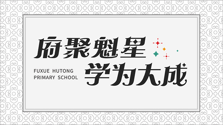 府聚魁星,明指学校凝聚魁星、汇聚文脉,象征学校育人成才;学为大成,明指学校正在做着大成至圣先师所做的事情,象征每一个人学业大成。“府聚魁星,学为大成”反映了府学胡同小学对于现代教育发展的追求,表达了学校对学生成长的美好期望,是学校对历史的致敬、对未来的承诺。