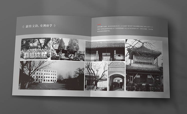 学校的殿堂阁祠,融入了品牌形象,酝酿着品牌气质。棂星门的庄重喻示入泮启智,魁星阁的檐角呼应魁星点斗,明伦堂的堂皇体现明伦育德,大成殿的巍峨暗合学抵大成。朱红色渲染整体,这是对品牌标志的连接,也是府学世界的扩展。灰瓦覆盖屋顶,于张力之中有收敛,于大气之中有雅致。天青装点门楣,既显生机勃然,又显高昂悠远。体现在画册中,既守庄重,又显雅趣,在传统制式中注入时代气息,古韵今风,相得益彰。