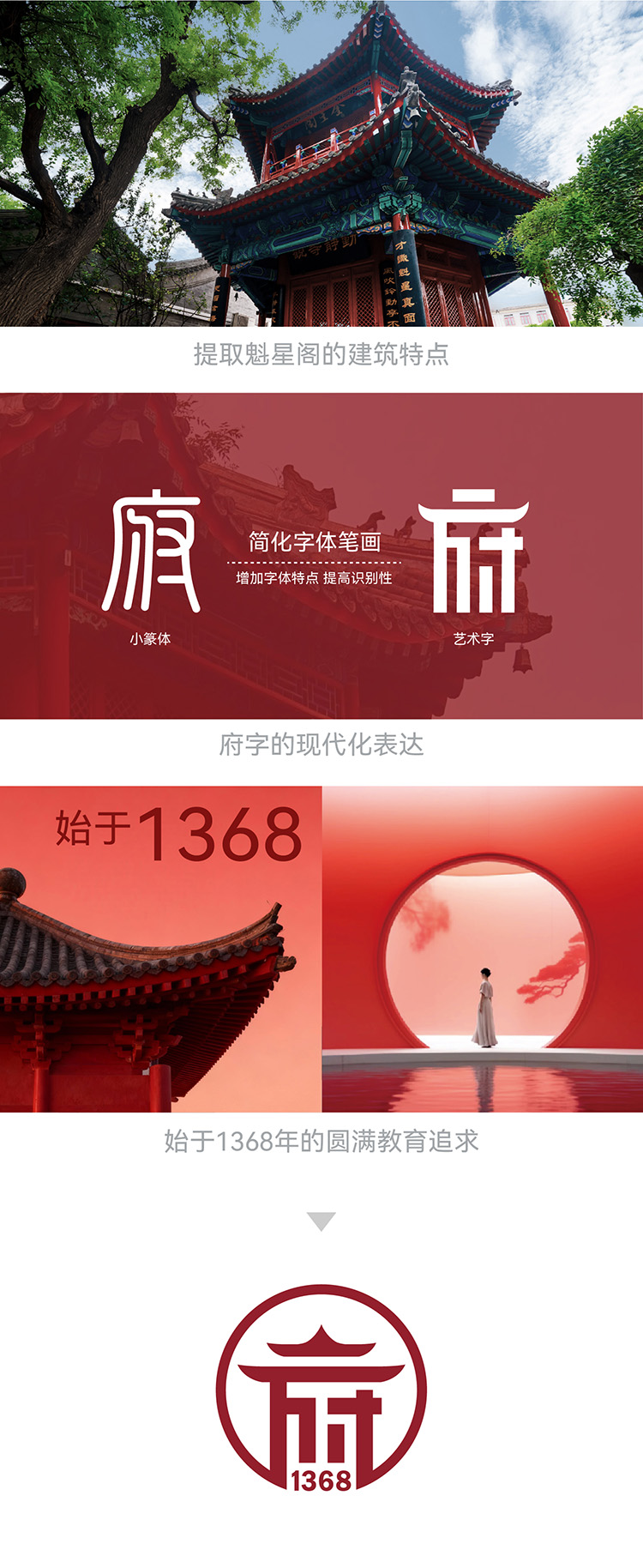 标志之色,朱红藏韵,温暖大气。这是传承之红,取魁星阁檐柱的漆色,现岁月沉淀的旧红,以及府学风华、文脉典雅。这是成长之红,在“成人成才成大器”的过程中,每一个脚步都需要热情和榜样。这是中华之红,体现出“爱国向善,崇礼尚学”的谆谆教诲,始终与国家、与民族同呼吸、共命运。府阁一体,朱红染梦,府聚魁星,学为大成。