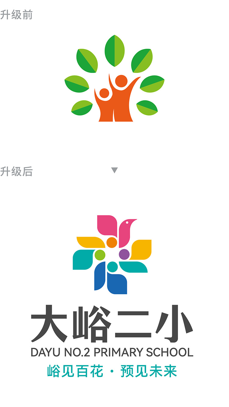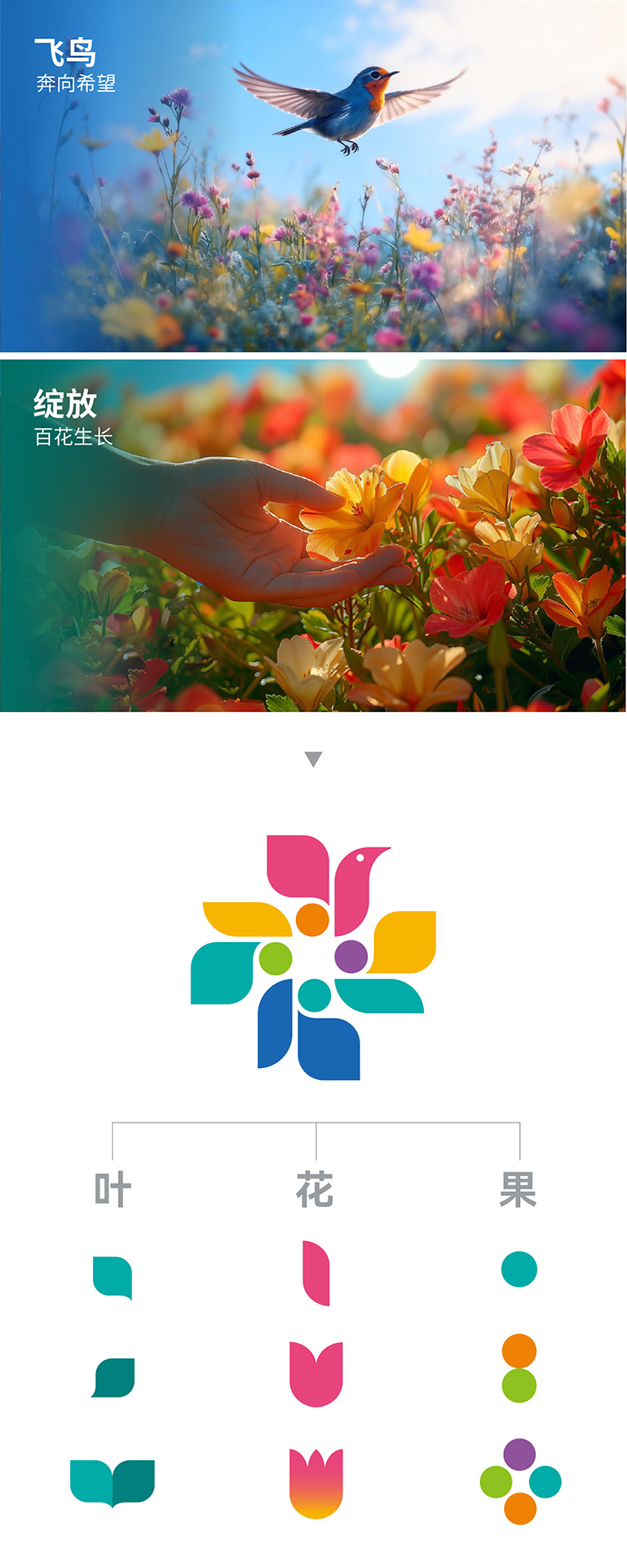 大峪二小的品牌标志,将校园刻画为“百花谷”,成就了眼中的美好。标志之形,似花,几何花瓣,形态各异,绽放着生命的多样与个性之美;似果,四个彩色小点居其中,圆融而饱满,蕴藏着教育带来的成长与收成;似谷,周正圆润,气场开阔,象征学校涵养生命的教育生态,呼应门头沟山峦叠嶂、河谷滋养的地域意象。顶部花瓣,仅用一个白色圆点,巧妙地让花瓣幻化成飞鸟,寓意生命绽放然后振翅高飞。这只飞鸟,从百花之中起飞,喙尖轻扬是“向阳而生”的朝气,羽翼舒展是“向美而行”的追求。