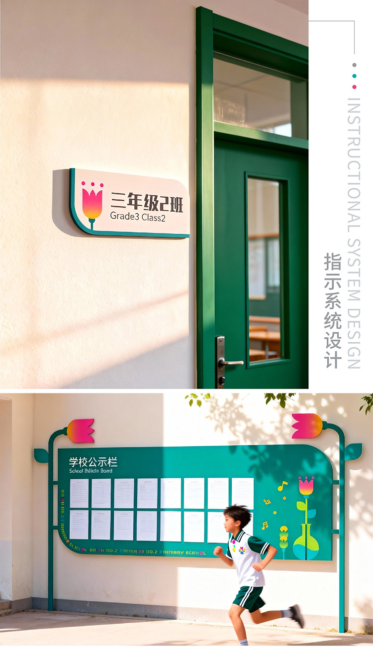 理念与视觉,最终要融入生命成长的日常,才能绽放出真正的芳香。品牌应用系统,便是让文化从画面走进生活,让芳香弥漫生命。当“百花”绽放在师生的服饰上,文化便成为一种随身的气质与认同。当指示系统不再只是冰冷的指示,而成为“百花谷”中的诗意引导,每一次转角都仿若一次探索。笔记本、道旗、宣传栏......所有触手可及的物品,都承载着一致的视觉语言,形成一个强大而温润的文化场域。